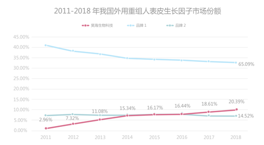 今天,我们将为大家带来昊海生物科技旗下明星产品市场潜力系列报告的最后一期,着重介绍一下我们的一类新药“外用重组人表皮生长因子”的市场情况。根据广州标点医药信息股份有限公司发布的《2011-2018年我国外用重组人表皮生长因子市场研究报告》,昊海生物科技已连续5年蝉联我国外用重组人表皮生长因子市场亚军,2018年市场份额达20.39%,与第一名的市场份额差距持续缩小。