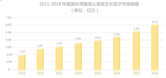 外用重组人表皮生长因子应用领域广泛,在烧伤、糖尿病足、皮肤褥疮等外科创面修复领域均发挥了很好的修复作用。同时,在整形美容领域中,外用重组人表皮生长因子也是祛斑后修复皮肤表皮的理想产品。值得关注的是,除了具有疗效明确、适应范围广泛的优势外,重组人表皮生长因子在2017年版国家医保药品目录中从2009年版医保限制为工伤保险用药调整为医保乙类药品,医保限制的解除对于产品的市场增长也具有一定的促进作用。报告显示,我国外用重组人表皮生长因子市场规模从2011年的2.02亿元增至2018年的6.13亿元,复合增长率达17.52%。