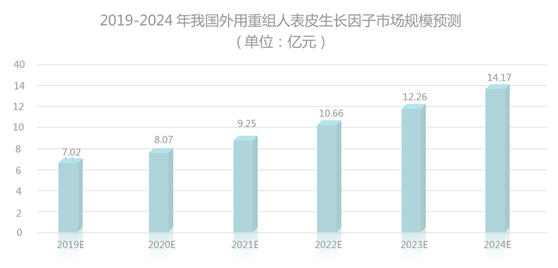 综合上述分析,可以看出外用重组人表皮生长因子的市场潜在需求还会越来越大。报告分析,我国外用重组人表皮生长因子市场规模到2024年可达14.17亿元,年复合增长率达15.08%。