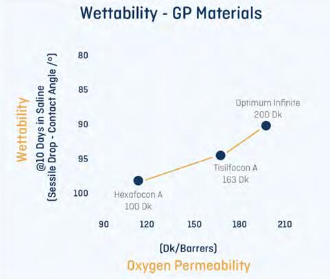 Optimum Infinite的出现,打破了过往角膜接触镜行业中存在的一个公认法则,即硬性镜片的透氧率越高,其抗折褶性、车削性、抗刮伤性以及润湿性则会越低。更令人兴奋的是,该材料解决了以往长期佩戴巩膜镜会引起角膜缺氧的问题。研究显示,为了保持眼睛健康,巩膜镜的最低透氧率应为180 Barrer,而200 Barrer的Optimum Infinite是目前唯一能达到这个标准且获得FDA核准的材料。