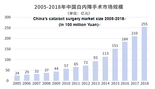 Calculated based on the number of cataract surgeries and per capita medical expenses of cataract surgery at public hospitals in 2005-2018 as published by the “Looking at the progress of cataract prevention and treatment in China from big data”, thanks to the fast growth of cataract surgeries and steadily increased per customer transaction, China’s cataract surgery market has grown from 2.4 billion Yuan in 2005 to 25.5 billion Yuan in 2018, a more than tenfold growth.