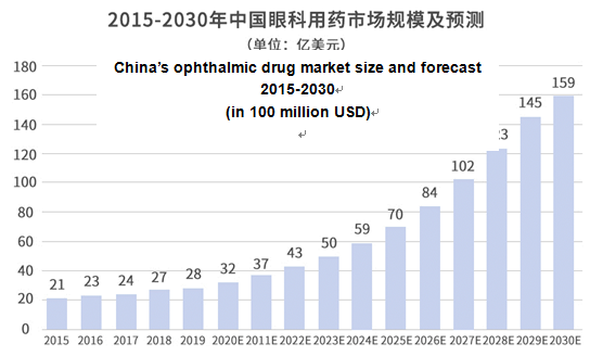 According to a Frost & Sullivan research report, China’s ophthalmic drug market has been growing rapidly, from 2.1 billion USD in 2015 to 2.8 billion USD in 2019, with a CAGR of 8.0%. It is expected that this figure will further grow to 5.9 billion USD in 2024 with a CAGR of 16.0% from 2019 onwards, and further to 16.9 billion USD in 2030 with a CAGR of 19.1% from 2024 onwards.