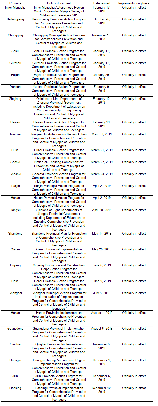 Provincial implementation/action plans for prevention and control of myopia of children and teenagers issued in selected provinces (municipalities and autonomous regions) in China