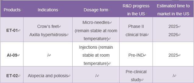 AI-09 series Type A botulinum toxin products for liquid injection are easier to use clinically than the widely-adopted lyophilized powder dosage form of the existing Type A botulinum toxin products already on the market. In addition, ET-01 and AI-09 can remain stable at room temperature, thus allowing significantly reduced transport and storage costs of products. Currently, Eirion is pushing for the marketing authorization application for AI-09, which is expected to be approved for marketing in the US in 2025. Meanwhile, the company plans to apply for registration simultaneously in China.